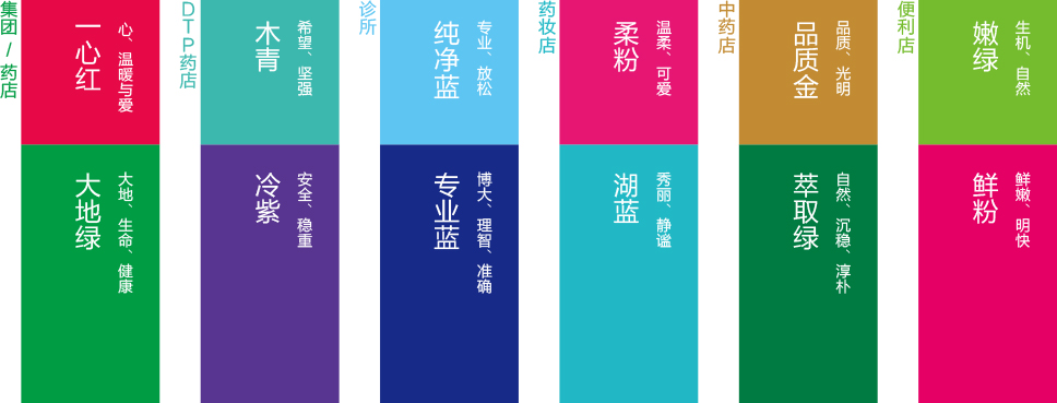 我們通過戰(zhàn)略色彩配置實(shí)現(xiàn)一心堂“家族統(tǒng)一,業(yè)態(tài)獨(dú)立”的品牌戰(zhàn)略定位。集團(tuán)所有業(yè)態(tài)保持相互協(xié)同的同時(shí)也要強(qiáng)化空間布局,購買體驗(yàn),核心品類策略的設(shè)計(jì)。