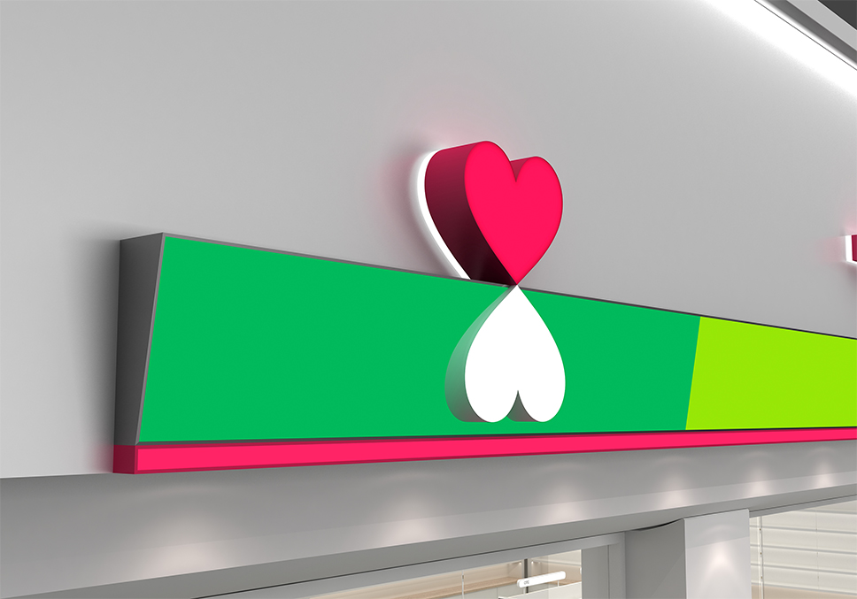 在云南,一心堂明亮的綠色早就融入了百姓的生活。雖然消費(fèi)者與員工都覺得現(xiàn)在的色彩沉悶而壓抑,但門店中應(yīng)用的綠色和紅色的品牌名稱,已經(jīng)形成了品牌的資產(chǎn),是消費(fèi)者對(duì)一心堂的印象與最大辨識(shí)點(diǎn)。于是我們決定保留這一份情懷與認(rèn)知,在門頭依舊使用綠色和紅色,同時(shí)放大品牌名稱。讓老顧客不感到陌生,能迅速識(shí)別,讓新顧客看到,走進(jìn)門店。