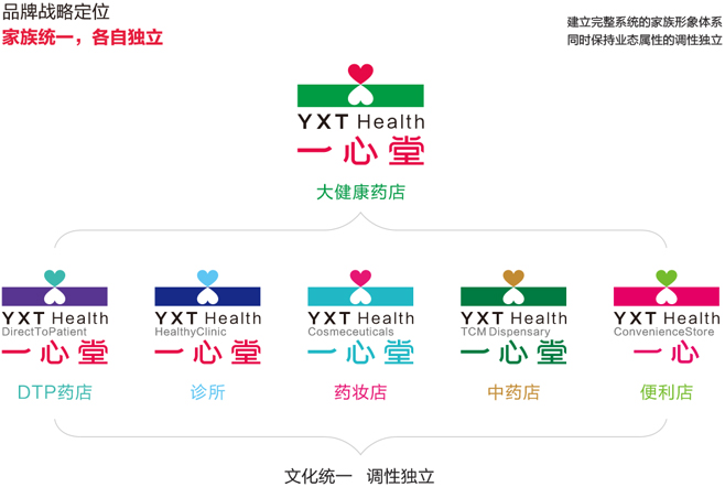 一心堂未來是要構(gòu)建多業(yè)態(tài)大健康產(chǎn)業(yè)鏈的,集團(tuán)旗下會(huì)有很多業(yè)態(tài),那么怎么才能先通過品牌外在形象實(shí)現(xiàn)一開始定下的“家族統(tǒng)一,業(yè)態(tài)獨(dú)立”的品牌戰(zhàn)略定位呢?