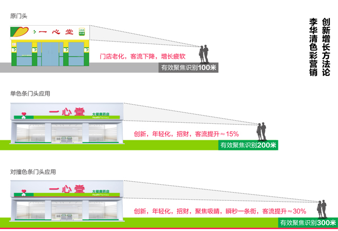 經(jīng)過我們李華清研究小組的測(cè)算分析,如果一心堂原來的門頭只能讓人在百米開外看到,那么加了色條的門頭就能夠在200米內(nèi)引導(dǎo)人們的視線;而將綠色條下再襯以高反差的紅色,就能夠在300米內(nèi)視線聚焦。讓整條街道都能看到一心堂,實(shí)現(xiàn)焦點(diǎn)引流。