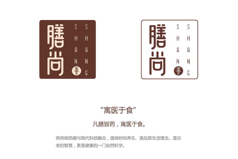 膳尚的標(biāo)志吸取了傳統(tǒng)印章的特點(diǎn),進(jìn)行簡(jiǎn)化,方中有圓,渾然天成,將安全可靠的老字號(hào)概念帶給人全新的時(shí)尚現(xiàn)代的氣息。字體設(shè)計(jì)圓潤(rùn)有富自然氣息,傳遞出品牌滋養(yǎng)身心、健康生態(tài)的屬性特點(diǎn),打破傳統(tǒng)排列方式,使得品牌更加具有獨(dú)特個(gè)性。