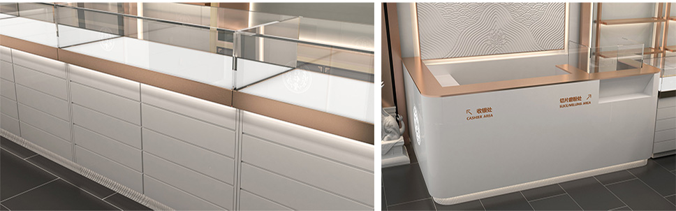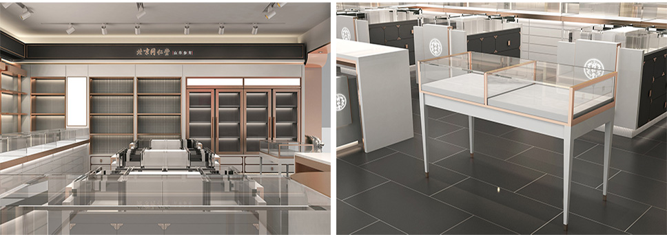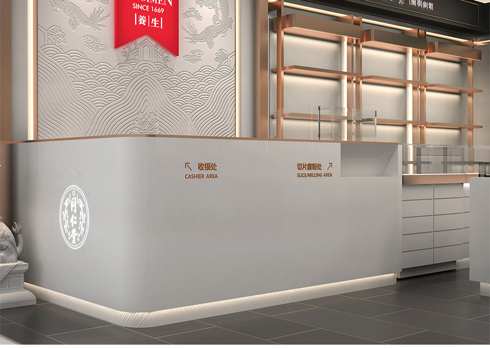 采用深灰、白和玫瑰金色搭配,使整體店面既有富麗堂皇之氣場,也有清新脫俗之雅韻。一方面與同仁堂傳統(tǒng)店面形象區(qū)分開來,另一方面在傳承同仁堂文化的同時也對同仁堂形象進(jìn)行了升華,使其店面更具視覺特點和識別性;更加現(xiàn)代時尚,符合未來人群的審美情趣。