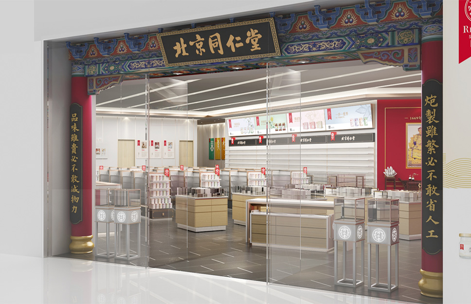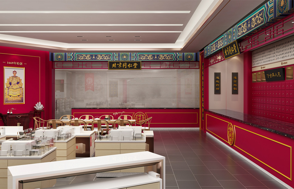 以中國傳統(tǒng)的對稱平衡為基本原則,以戶為門,以牖為窗,在保留了同仁堂經(jīng)典元素的同時進(jìn)行店面優(yōu)化升級。