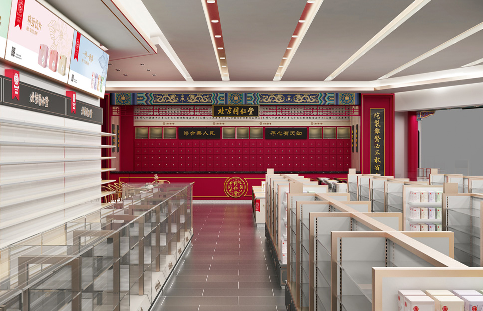 內(nèi)部設(shè)計相比外部設(shè)計而言,涉及的設(shè)計元素更多,難度也更大。涉及的元素包括通道、柜臺、色彩、燈光、音樂、商品陳列布局等。我們依據(jù)同仁堂的文化屬性,強(qiáng)化空間布局及持續(xù)改善功能,讓顧客停下腳步,體驗、了解商品,實現(xiàn)產(chǎn)品動銷,門店增量。