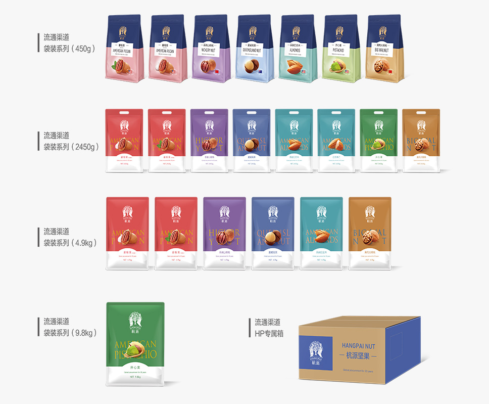 杭派堅(jiān)果主要是碧根果、巴旦木、山核桃、開(kāi)心果、夏威夷果、核桃六大品類(lèi)的產(chǎn)品線(xiàn)延伸,在色彩資源配置上每個(gè)堅(jiān)果品類(lèi)獨(dú)占一個(gè)色系,在可以在消費(fèi)者心中形成一個(gè)專(zhuān)屬色。