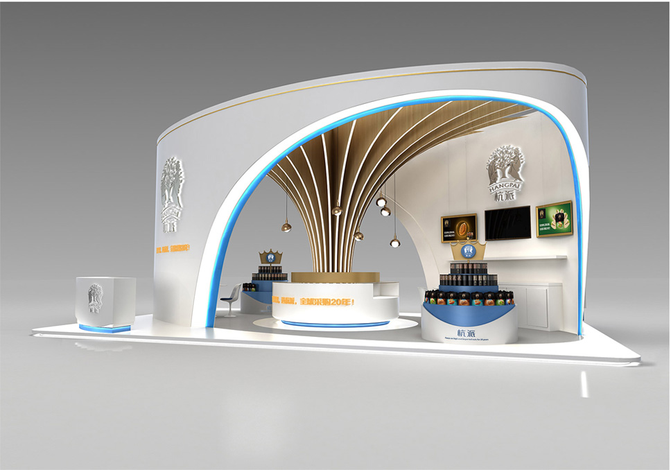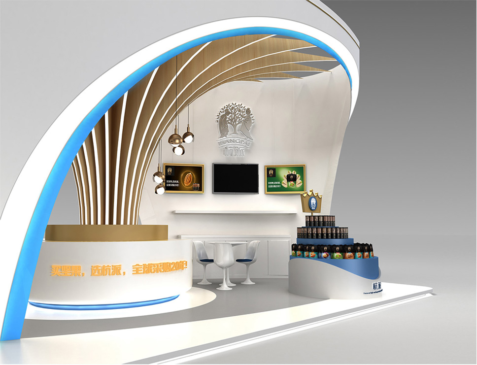 李華清空間設(shè)計(jì)公司定位的杭派展位形象延續(xù)品牌形象靈魂,堅(jiān)果樹(shù)的造型具有行業(yè)屬性特征和很強(qiáng)的辨識(shí)度,橢圓的主造型與堅(jiān)果產(chǎn)品本身的造型相契合,獨(dú)特的發(fā)光樹(shù)造型展示臺(tái)和堅(jiān)果創(chuàng)意吊燈,既寓意繁茂的盛景,又使空間設(shè)計(jì)增加了意境和豐富視覺(jué)感。色彩系統(tǒng)采用了木質(zhì)、白和藍(lán)色搭配,現(xiàn)代簡(jiǎn)約的調(diào)性使展位設(shè)計(jì)整體清新雅致。現(xiàn)場(chǎng)造型吸引了大批消費(fèi)者,加深了品牌認(rèn)知,構(gòu)建了杭派高端休閑食品的品牌形象。