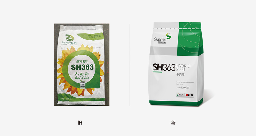 優(yōu)質食葵品種SH363、SH363等在新疆三瑞已經穩(wěn)定經營了十幾年,深受消費者信任,產品型號已經成為企業(yè)的重要資產,無疑產品型號是整個畫面中最關鍵的信息,李華清運用黃金比例法則,將產品型號作為位置商標在整個畫面的最佳位置排布,從而達到有效識別.