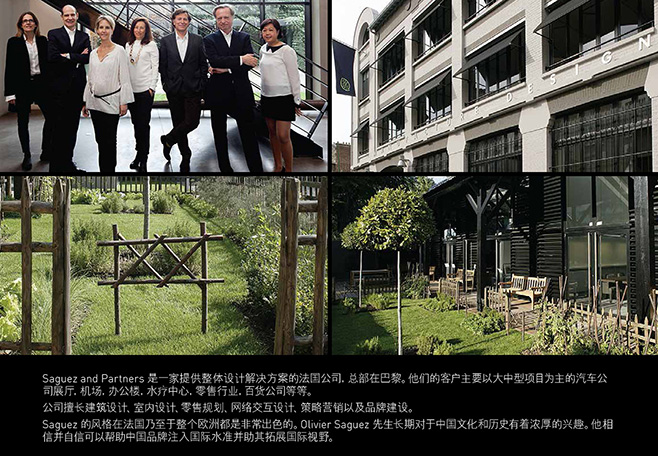 Saguez & Partners的總部在巴黎,是法國(guó)最大的設(shè)計(jì)公司擁有120名雇員,年?duì)I業(yè)額2.3億元在歐洲商業(yè)規(guī)劃設(shè)計(jì)方面Saguez處于領(lǐng)先地位,從項(xiàng)目的整體規(guī)劃、設(shè)計(jì)、外立面包括內(nèi)部裝修設(shè)計(jì)等視覺方面均有不俗的建樹。主要客戶有法國(guó)的“老佛爺”商場(chǎng)、巴黎機(jī)場(chǎng)、法國(guó)標(biāo)致車等等。公司擅長(zhǎng)建筑設(shè)計(jì)、室內(nèi)設(shè)計(jì)、零售規(guī)劃、網(wǎng)絡(luò)交互設(shè)計(jì)、策略營(yíng)銷以及品牌建設(shè)。